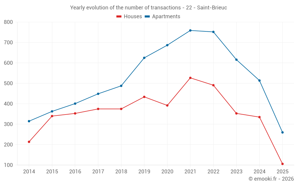 The median price on the 118 apartment transactions of the last 3 months in the municipality of Saint-Brieuc was 1 826 € per square meter for a median property value of 102 000 €. Over this period, 60% of transactions were between 1 438 and 2 285 € per square meter (from the 2nd to the 8th deciles).