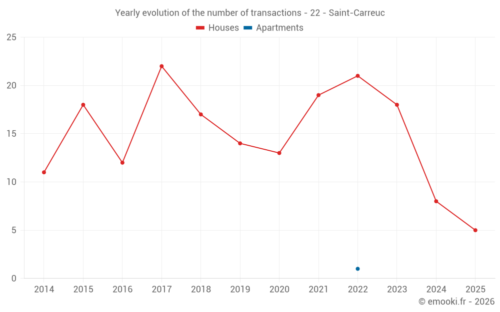 The median price on the 18 house transactions of the last 24 months in the municipality of Saint-Carreuc was 1 532 € per square meter for a median property value of 150 950 €. Over this period, 60% of transactions were between 1 107 and 2 266 € per square meter (from the 2nd to the 8th deciles).
