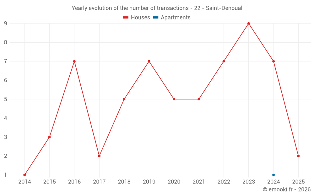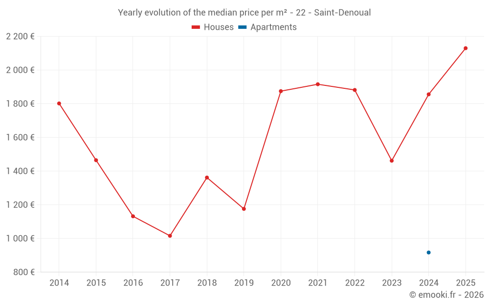 The median price on the 14 house transactions of the last 24 months in the municipality of Saint-Denoual was 1 726 € per square meter for a median property value of 184 025 €. Over this period, 60% of transactions were between 1 154 and 2 298 € per square meter (from the 2nd to the 8th deciles).