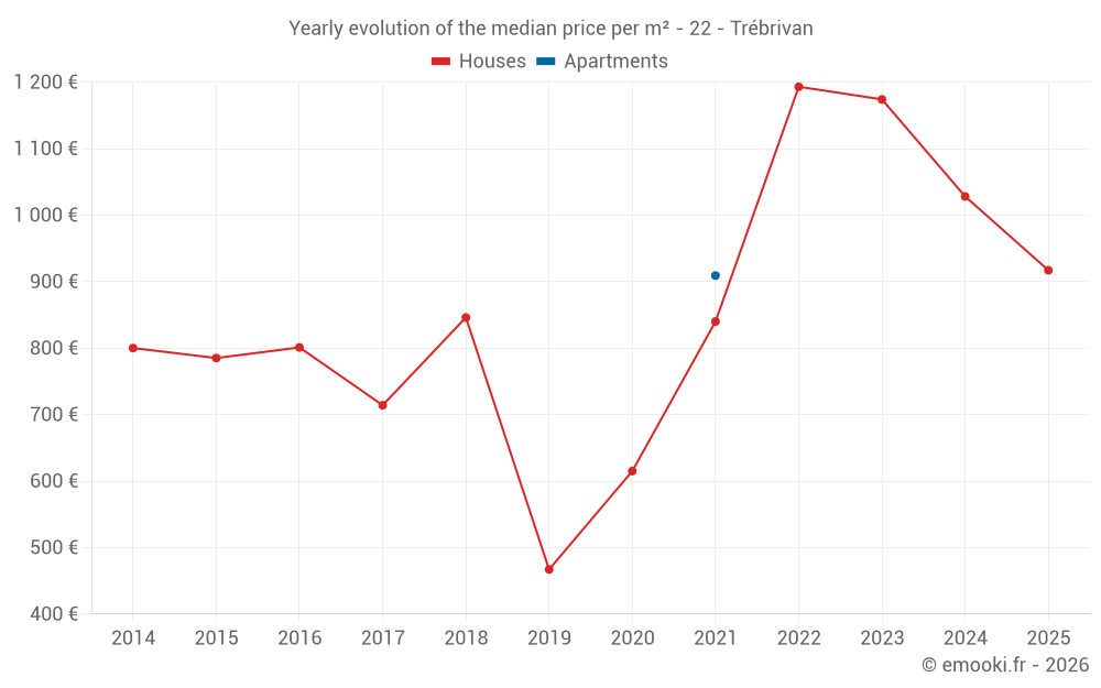 The median price on the 27 house transactions of the last 24 months in the municipality of Trébrivan was 1 028 € per square meter for a median property value of 95 400 €. Over this period, 60% of transactions were between 737 and 1 476 € per square meter (from the 2nd to the 8th deciles).