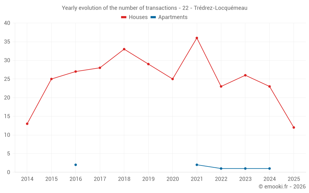 The median price on the 27 house transactions of the last 12 months in the municipality of Trédrez-Locquémeau was 2 589 € per square meter for a median property value of 250 000 €. Over this period, 60% of transactions were between 2 032 and 3 706 € per square meter (from the 2nd to the 8th deciles).