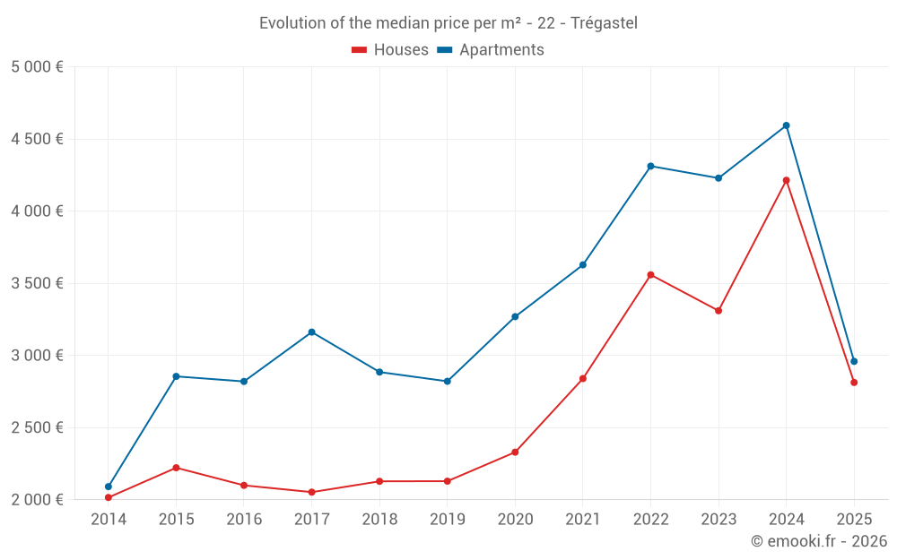 The median price on the 20 apartment transactions of the last 24 months in the municipality of Trégastel was 3 930 € per square meter for a median property value of 238 050 €. Over this period, 60% of transactions were between 2 854 and 5 297 € per square meter (from the 2nd to the 8th deciles).