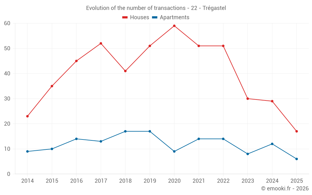 The median price on the 37 house transactions of the last 12 months in the municipality of Trégastel was 3 889 € per square meter for a median property value of 395 000 €. Over this period, 60% of transactions were between 2 596 and 5 383 € per square meter (from the 2nd to the 8th deciles).