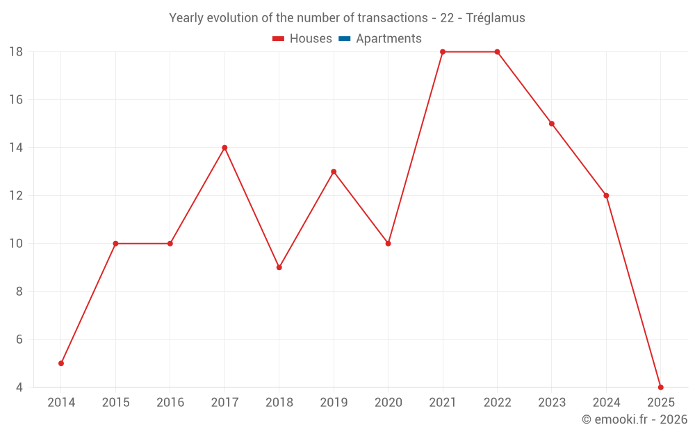 The median price on the 23 house transactions of the last 24 months in the municipality of Tréglamus was 1 942 € per square meter for a median property value of 165 000 €. Over this period, 60% of transactions were between 1 246 and 2 327 € per square meter (from the 2nd to the 8th deciles).