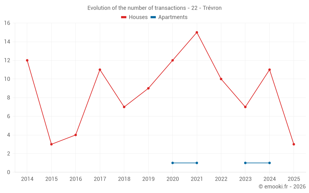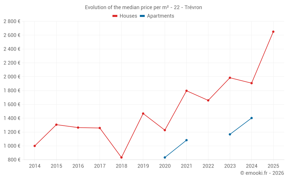 The median price on the 19 house transactions of the last 24 months in the municipality of Trévron was 2 143 € per square meter for a median property value of 175 000 €. Over this period, 60% of transactions were between 1 494 and 2 744 € per square meter (from the 2nd to the 8th deciles).