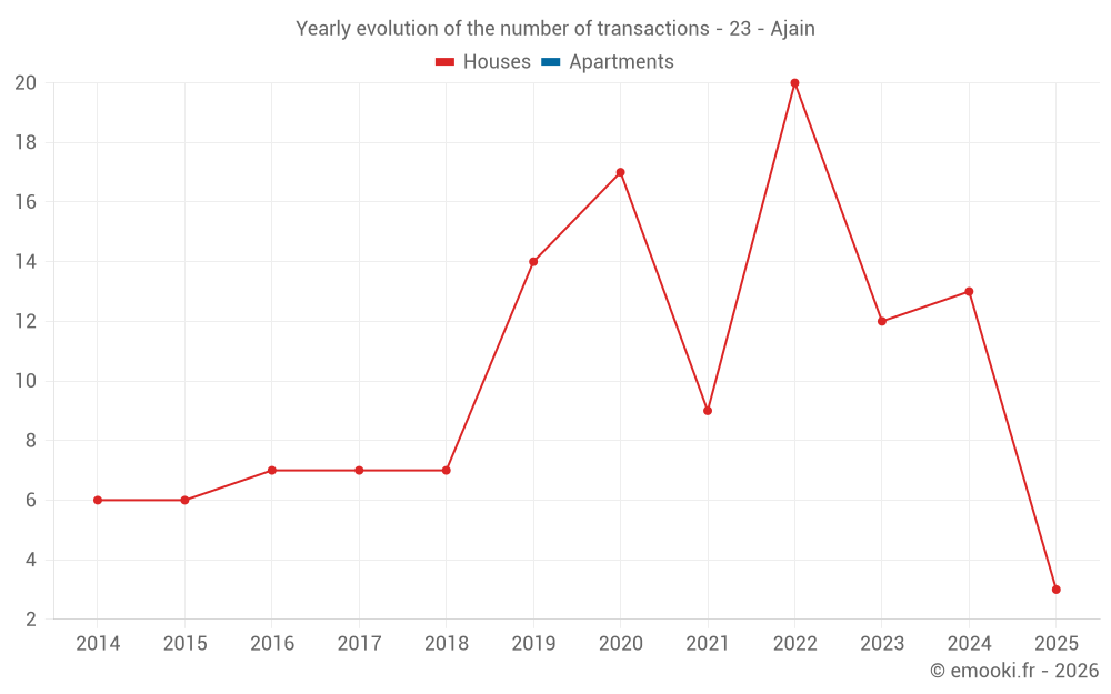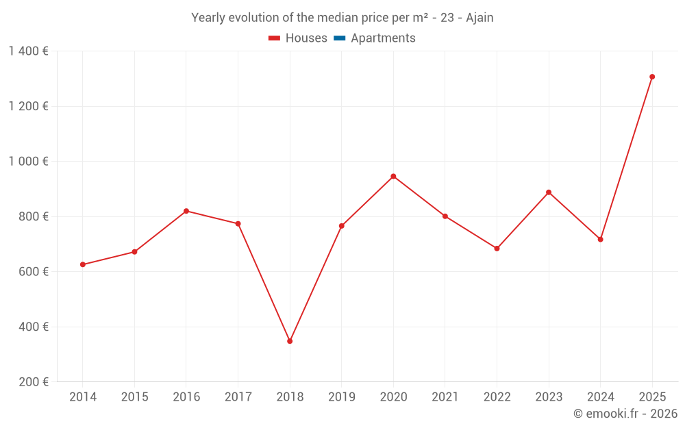 The median price on the 25 house transactions of the last 24 months in the municipality of Ajain was 792 € per square meter for a median property value of 90 000 €. Over this period, 60% of transactions were between 506 and 1 349 € per square meter (from the 2nd to the 8th deciles).