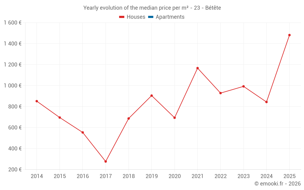 The median price on the 27 house transactions of the last 24 months in the municipality of Bétête was 965 € per square meter for a median property value of 51 000 €. Over this period, 60% of transactions were between 645 and 1 426 € per square meter (from the 2nd to the 8th deciles).