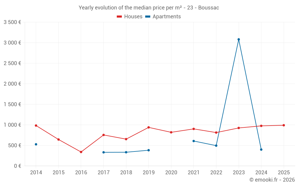The median price on the 16 house transactions of the last 12 months in the municipality of Boussac was 892 € per square meter for a median property value of 88 500 €. Over this period, 60% of transactions were between 745 and 1 358 € per square meter (from the 2nd to the 8th deciles).