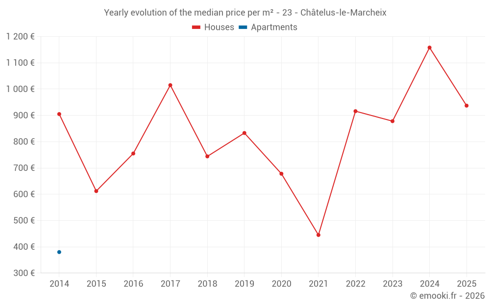 The median price on the 23 house transactions of the last 24 months in the municipality of Châtelus-le-Marcheix was 1 121 € per square meter for a median property value of 70 000 €. Over this period, 60% of transactions were between 668 and 1 388 € per square meter (from the 2nd to the 8th deciles).