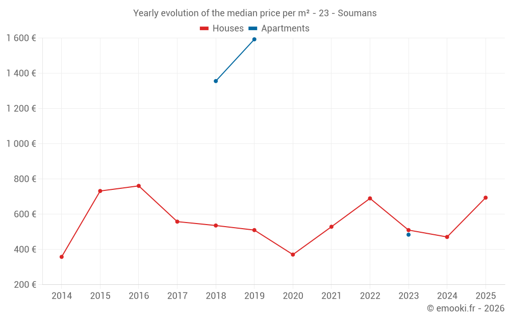 The median price on the 22 house transactions of the last 24 months in the municipality of Soumans was 586 € per square meter for a median property value of 51 500 €. Over this period, 60% of transactions were between 427 and 1 137 € per square meter (from the 2nd to the 8th deciles).