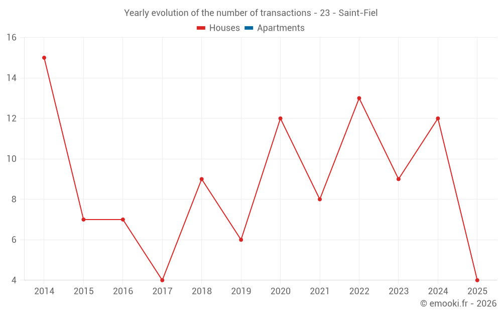 The median price on the 22 house transactions of the last 24 months in the municipality of Saint-Fiel was 996 € per square meter for a median property value of 86 500 €. Over this period, 60% of transactions were between 541 and 1 568 € per square meter (from the 2nd to the 8th deciles).