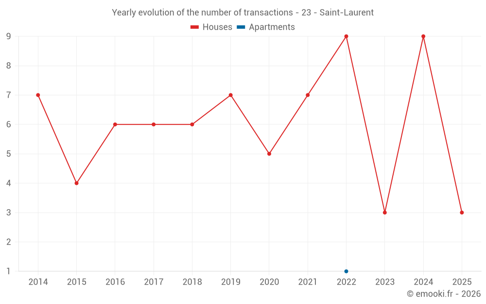 The median price on the 14 house transactions of the last 24 months in the municipality of Saint-Laurent was 1 334 € per square meter for a median property value of 158 500 €. Over this period, 60% of transactions were between 880 and 1 484 € per square meter (from the 2nd to the 8th deciles).