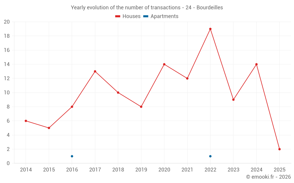 The median price on the 21 house transactions of the last 24 months in the municipality of Bourdeilles was 1 930 € per square meter for a median property value of 207 000 €. Over this period, 60% of transactions were between 1 133 and 2 713 € per square meter (from the 2nd to the 8th deciles).