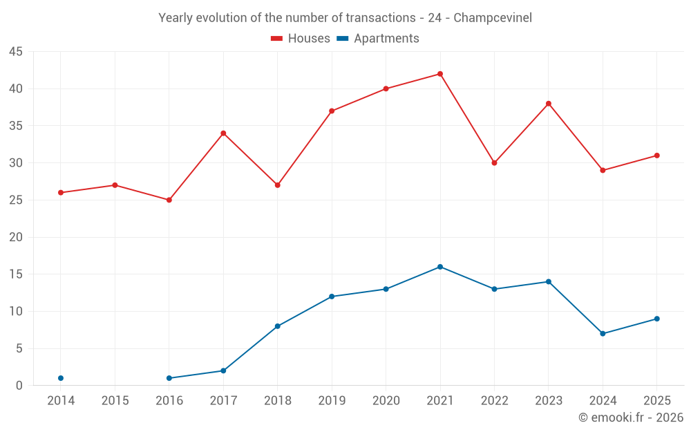 The median price on the 21 house transactions of the last 6 months in the municipality of Champcevinel was 2 027 € per square meter for a median property value of 197 000 €. Over this period, 60% of transactions were between 1 294 and 2 521 € per square meter (from the 2nd to the 8th deciles).