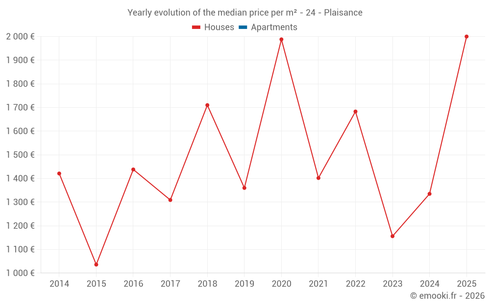 The median price on the 22 house transactions of the last 24 months in the municipality of Plaisance was 1 335 € per square meter for a median property value of 162 500 €. Over this period, 60% of transactions were between 826 and 2 616 € per square meter (from the 2nd to the 8th deciles).
