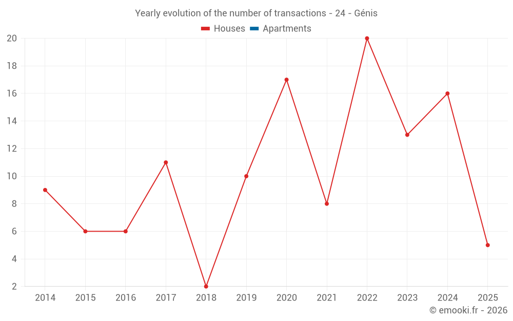 The median price on the 28 house transactions of the last 24 months in the municipality of Génis was 1 066 € per square meter for a median property value of 107 992 €. Over this period, 60% of transactions were between 676 and 1 665 € per square meter (from the 2nd to the 8th deciles).