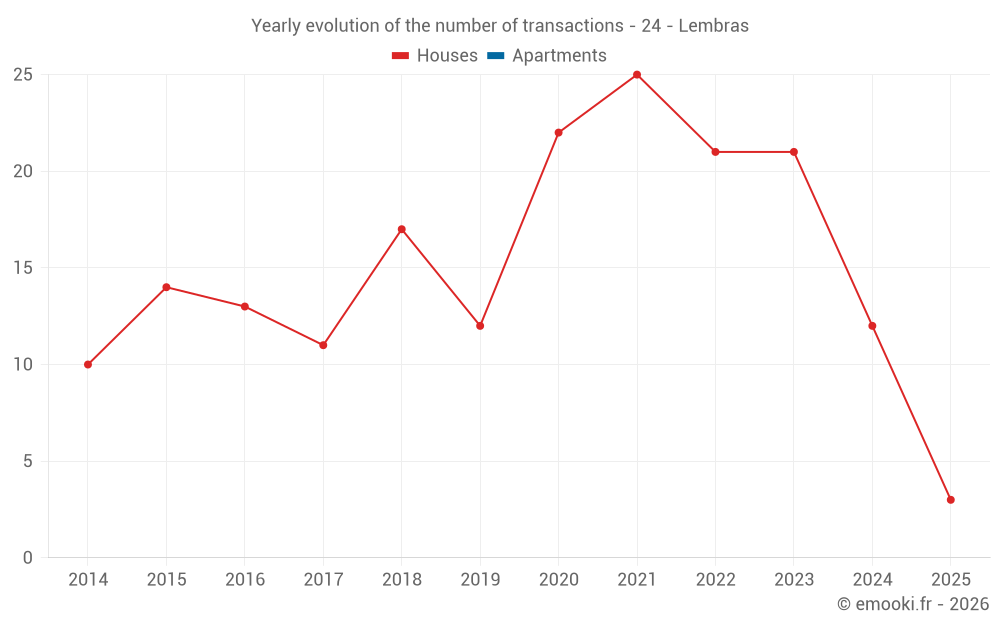 The median price on the 27 house transactions of the last 24 months in the municipality of Lembras was 1 787 € per square meter for a median property value of 156 200 €. Over this period, 60% of transactions were between 1 239 and 2 316 € per square meter (from the 2nd to the 8th deciles).