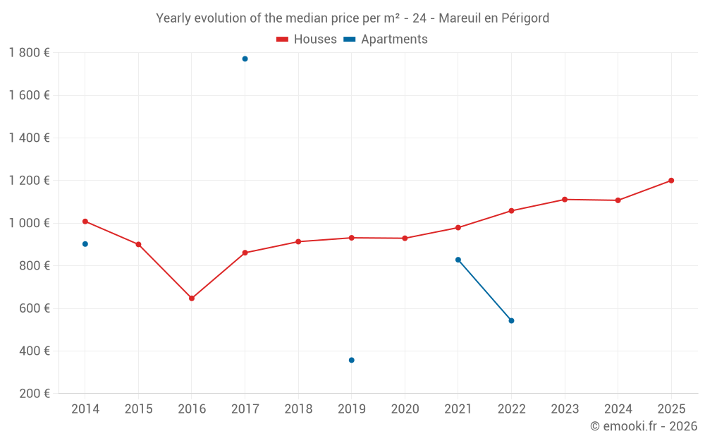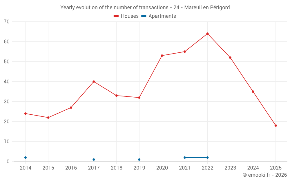 The median price on the 18 house transactions of the last 6 months in the municipality of Mareuil en Périgord was 1 200 € per square meter for a median property value of 111 305 €. Over this period, 60% of transactions were between 923 and 1 714 € per square meter (from the 2nd to the 8th deciles).