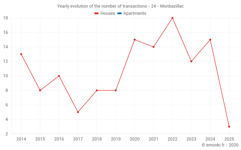 The median price on the 22 house transactions of the last 24 months in the municipality of Monbazillac was 1 708 € per square meter for a median property value of 197 740 €. Over this period, 60% of transactions were between 944 and 2 285 € per square meter (from the 2nd to the 8th deciles).