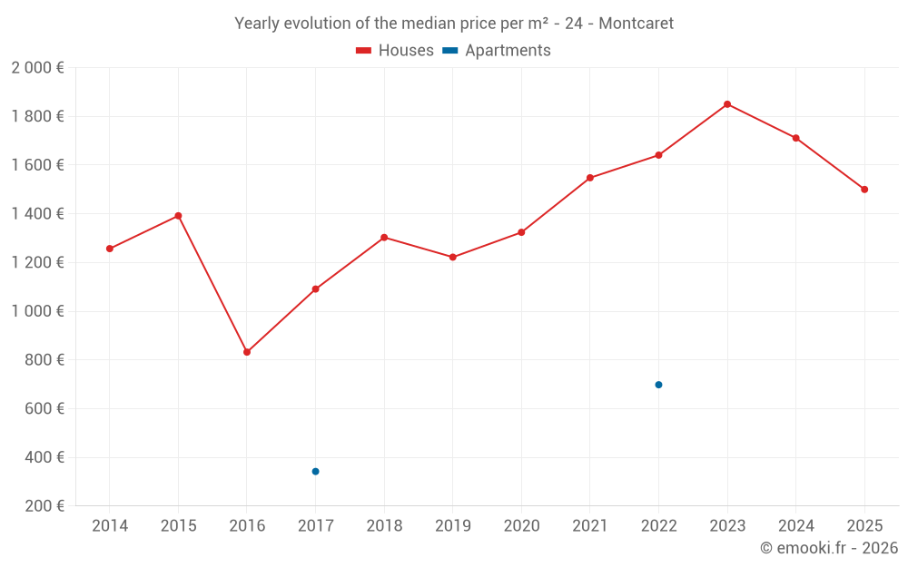 The median price on the 23 house transactions of the last 24 months in the municipality of Montcaret was 1 711 € per square meter for a median property value of 172 000 €. Over this period, 60% of transactions were between 1 010 and 2 196 € per square meter (from the 2nd to the 8th deciles).