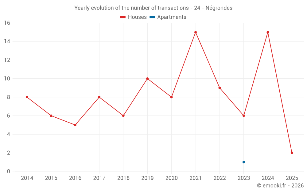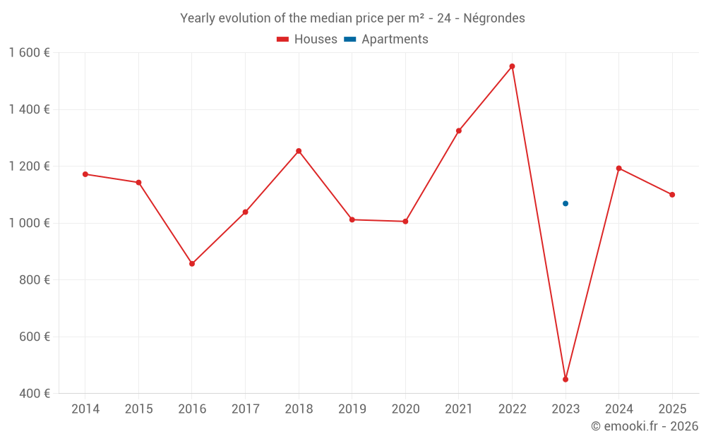The median price on the 19 house transactions of the last 24 months in the municipality of Négrondes was 1 071 € per square meter for a median property value of 110 185 €. Over this period, 60% of transactions were between 483 and 1 660 € per square meter (from the 2nd to the 8th deciles).