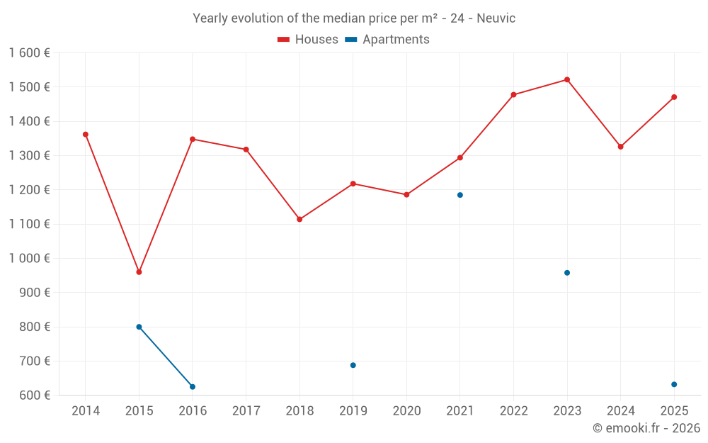 The median price on the 38 house transactions of the last 12 months in the municipality of Neuvic was 1 532 € per square meter for a median property value of 146 050 €. Over this period, 60% of transactions were between 853 and 2 011 € per square meter (from the 2nd to the 8th deciles).