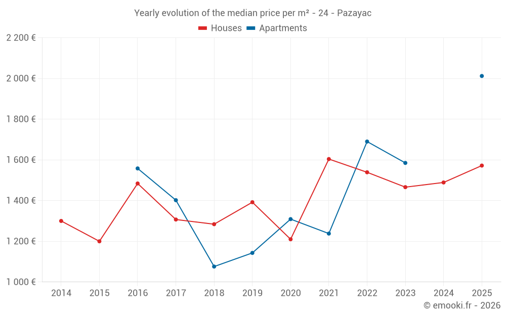 The median price on the 17 house transactions of the last 24 months in the municipality of Pazayac was 1 522 € per square meter for a median property value of 155 000 €. Over this period, 60% of transactions were between 1 224 and 1 702 € per square meter (from the 2nd to the 8th deciles).