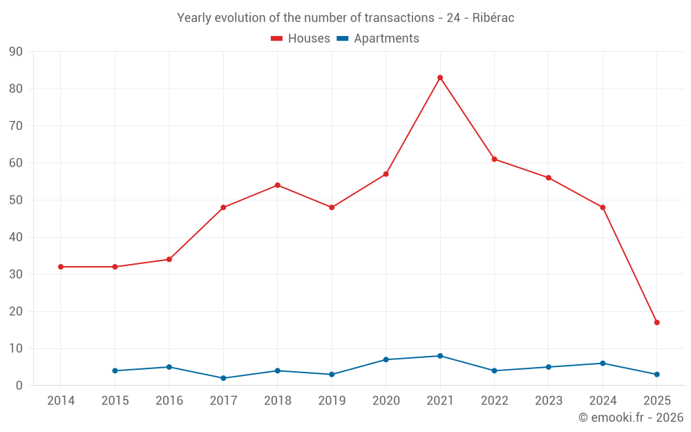 The median price on the 47 house transactions of the last 12 months in the municipality of Ribérac was 1 210 € per square meter for a median property value of 110 000 €. Over this period, 60% of transactions were between 680 and 1 913 € per square meter (from the 2nd to the 8th deciles).