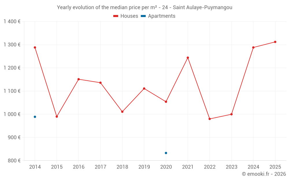 The median price on the 16 house transactions of the last 12 months in the municipality of Saint Aulaye-Puymangou was 1 364 € per square meter for a median property value of 135 000 €. Over this period, 60% of transactions were between 1 000 and 1 978 € per square meter (from the 2nd to the 8th deciles).