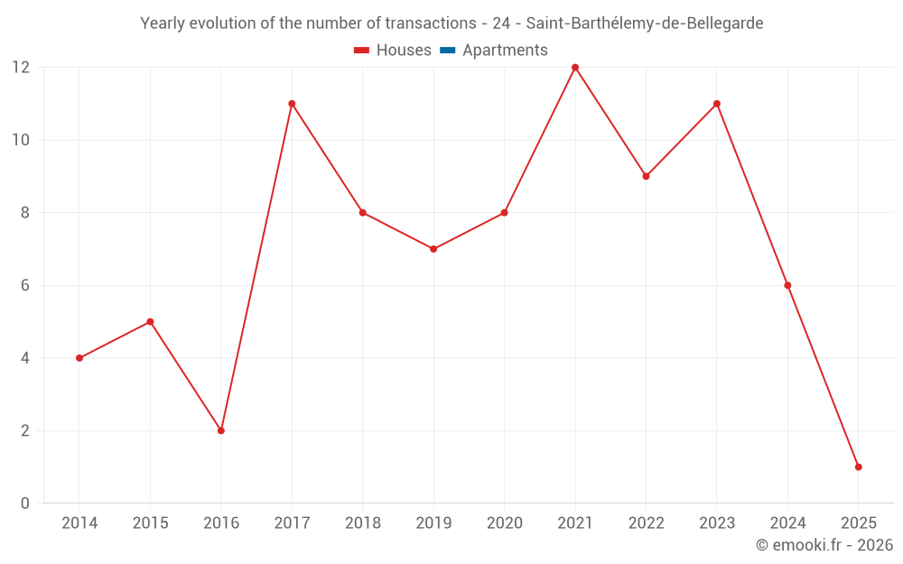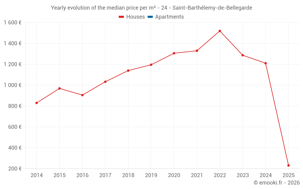 The median price on the 15 house transactions of the last 24 months in the municipality of Saint-Barthélemy-de-Bellegarde was 1 131 € per square meter for a median property value of 96 810 €. Over this period, 60% of transactions were between 657 and 1 490 € per square meter (from the 2nd to the 8th deciles).