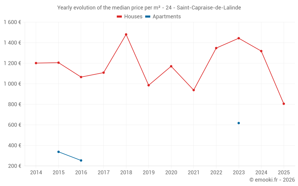 The median price on the 21 house transactions of the last 24 months in the municipality of Saint-Capraise-de-Lalinde was 1 400 € per square meter for a median property value of 110 000 €. Over this period, 60% of transactions were between 689 and 1 808 € per square meter (from the 2nd to the 8th deciles).