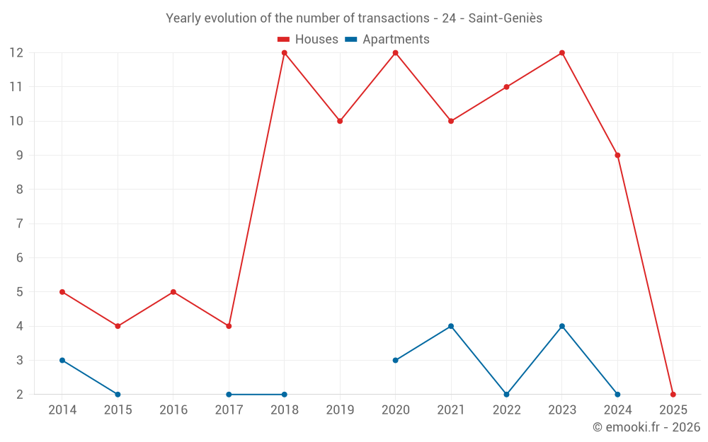 The median price on the 19 house transactions of the last 24 months in the municipality of Saint-Geniès was 2 183 € per square meter for a median property value of 264 600 €. Over this period, 60% of transactions were between 1 577 and 3 176 € per square meter (from the 2nd to the 8th deciles).