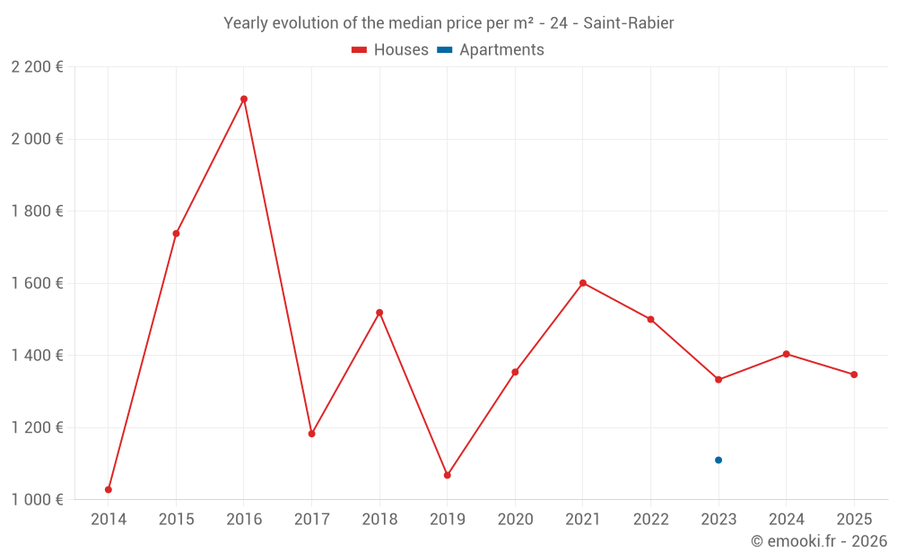 The median price on the 21 house transactions of the last 24 months in the municipality of Saint-Rabier was 1 347 € per square meter for a median property value of 135 000 €. Over this period, 60% of transactions were between 1 083 and 1 758 € per square meter (from the 2nd to the 8th deciles).