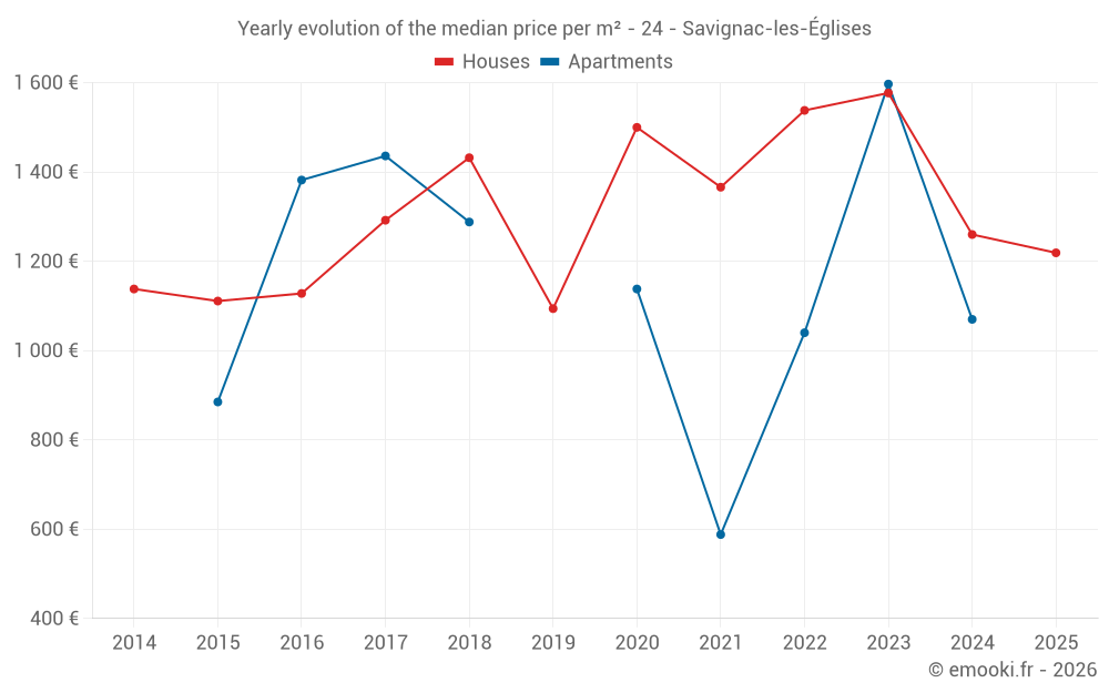 The median price on the 28 house transactions of the last 24 months in the municipality of Savignac-les-Églises was 1 346 € per square meter for a median property value of 155 000 €. Over this period, 60% of transactions were between 785 and 2 207 € per square meter (from the 2nd to the 8th deciles).