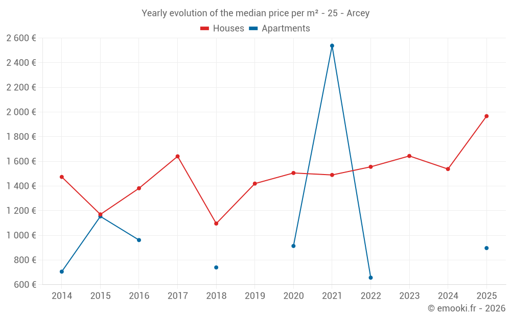 The median price on the 18 house transactions of the last 24 months in the municipality of Arcey was 1 552 € per square meter for a median property value of 154 250 €. Over this period, 60% of transactions were between 842 and 2 098 € per square meter (from the 2nd to the 8th deciles).