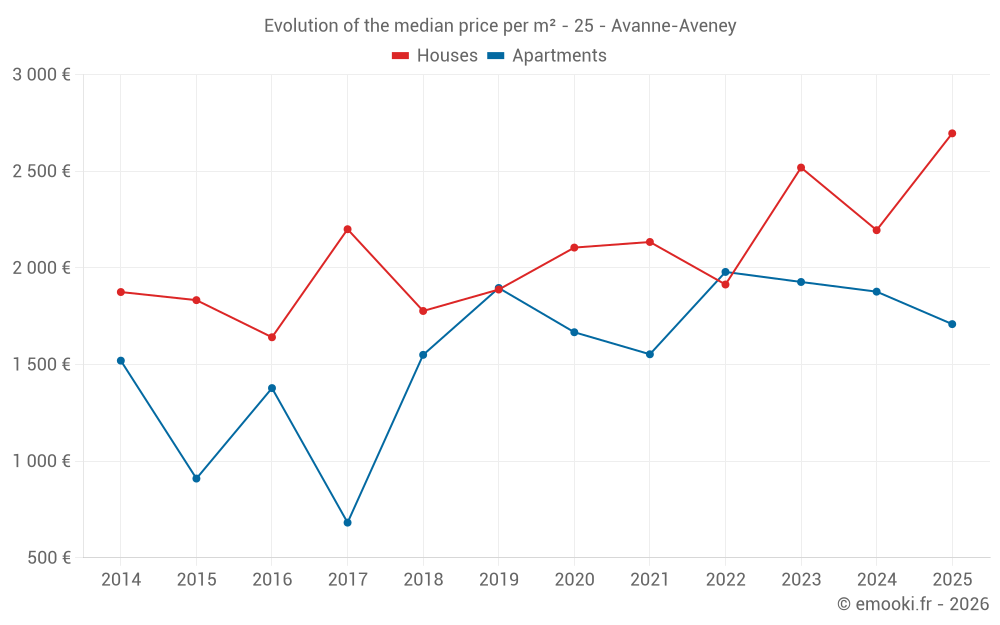 The median price on the 26 house transactions of the last 24 months in the municipality of Avanne-Aveney was 2 480 € per square meter for a median property value of 256 500 €. Over this period, 60% of transactions were between 1 753 and 3 084 € per square meter (from the 2nd to the 8th deciles).