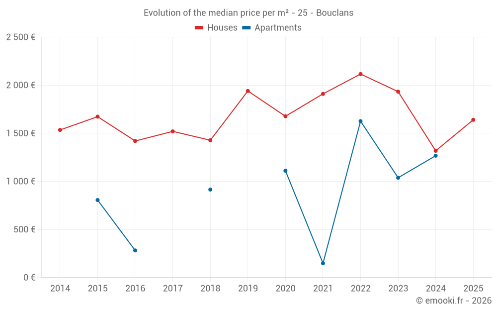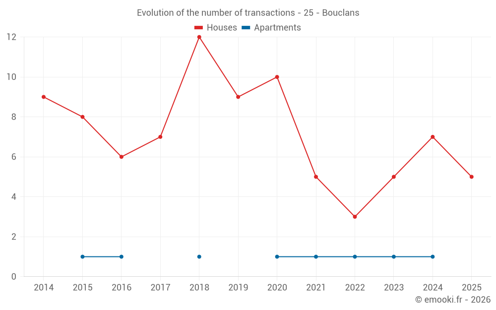 The median price on the 16 house transactions of the last 24 months in the municipality of Bouclans was 1 602 € per square meter for a median property value of 162 615 €. Over this period, 60% of transactions were between 1 296 and 2 597 € per square meter (from the 2nd to the 8th deciles).
