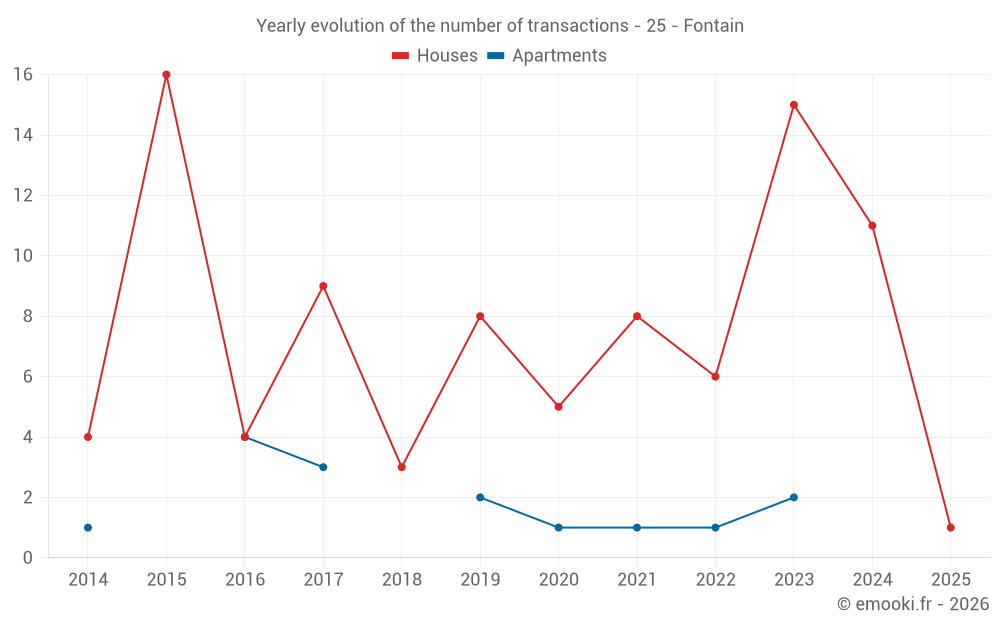 The median price on the 14 house transactions of the last 24 months in the municipality of Fontain was 2 281 € per square meter for a median property value of 254 250 €. Over this period, 60% of transactions were between 1 857 and 2 480 € per square meter (from the 2nd to the 8th deciles).