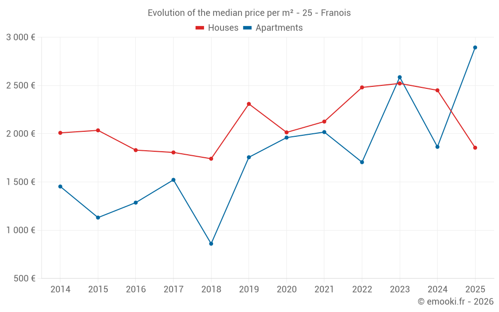 The median price on the 18 house transactions of the last 12 months in the municipality of Franois was 2 250 € per square meter for a median property value of 243 500 €. Over this period, 60% of transactions were between 1 731 and 2 539 € per square meter (from the 2nd to the 8th deciles).