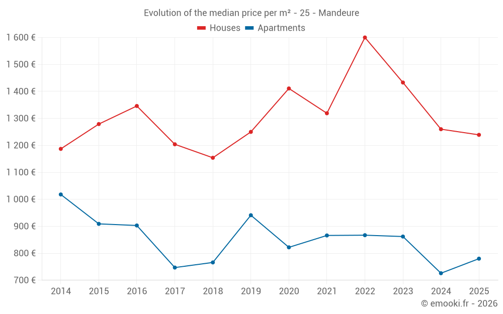 The median price on the 18 house transactions of the last 6 months in the municipality of Mandeure was 1 239 € per square meter for a median property value of 129 000 €. Over this period, 60% of transactions were between 1 082 and 1 665 € per square meter (from the 2nd to the 8th deciles).