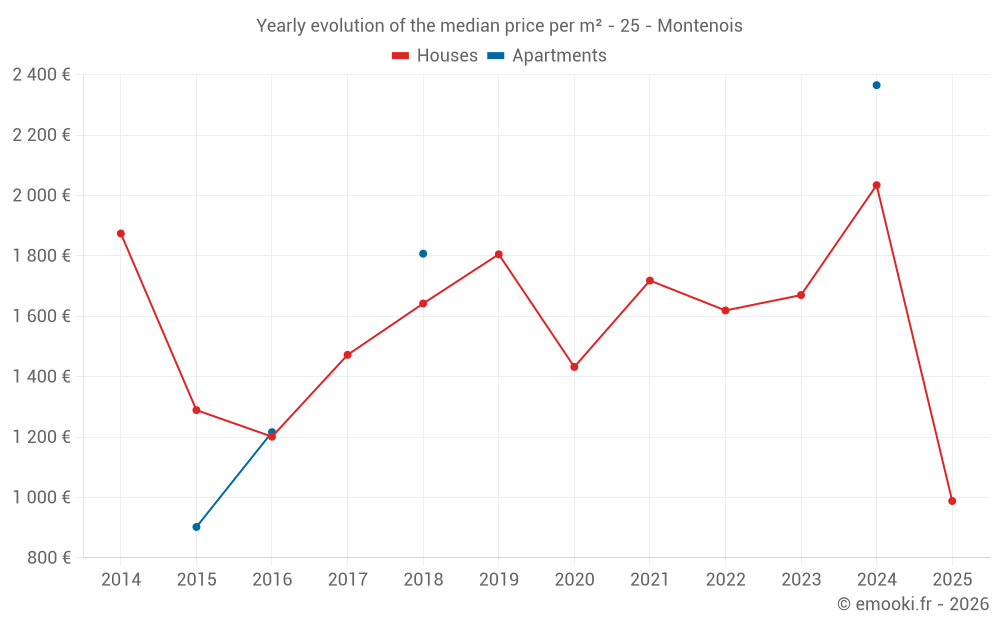 The median price on the 24 house transactions of the last 24 months in the municipality of Montenois was 1 478 € per square meter for a median property value of 139 000 €. Over this period, 60% of transactions were between 1 028 and 2 261 € per square meter (from the 2nd to the 8th deciles).