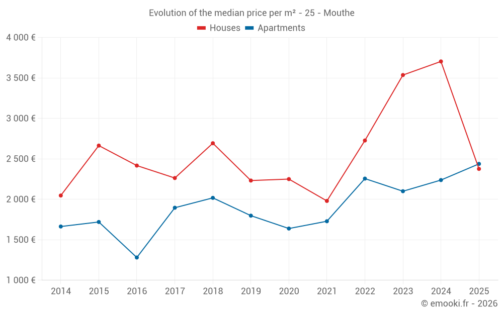The median price on the 30 apartment transactions of the last 24 months in the municipality of Mouthe was 2 116 € per square meter for a median property value of 137 000 €. Over this period, 60% of transactions were between 1 584 and 2 614 € per square meter (from the 2nd to the 8th deciles).