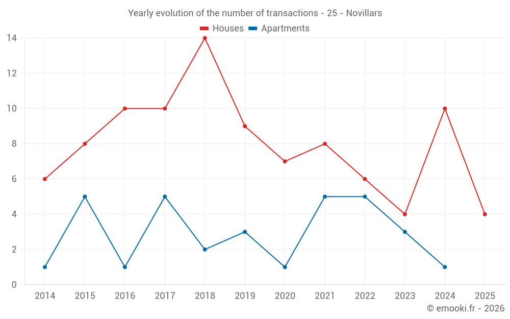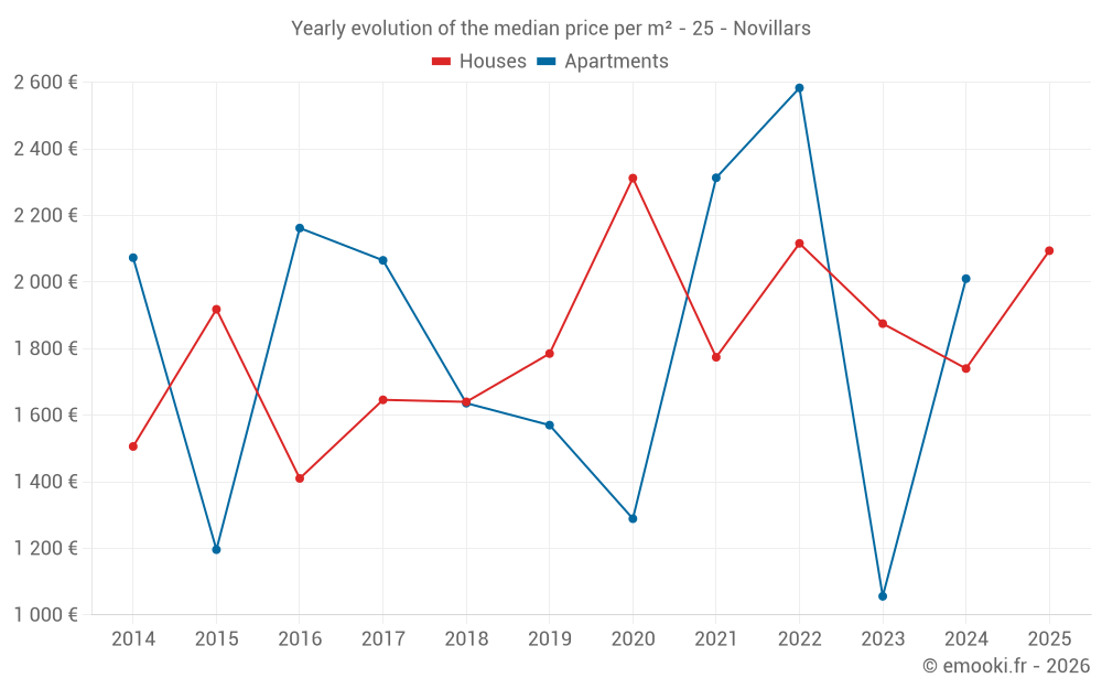 The median price on the 17 house transactions of the last 24 months in the municipality of Novillars was 1 796 € per square meter for a median property value of 200 000 €. Over this period, 60% of transactions were between 1 288 and 2 146 € per square meter (from the 2nd to the 8th deciles).