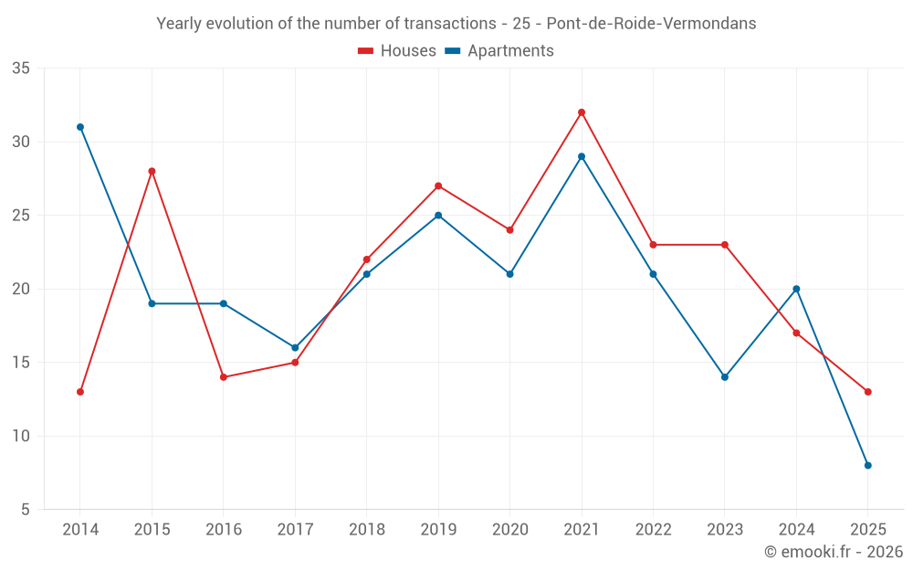 The median price on the 24 house transactions of the last 12 months in the municipality of Pont-de-Roide-Vermondans was 1 452 € per square meter for a median property value of 148 925 €. Over this period, 60% of transactions were between 1 031 and 1 859 € per square meter (from the 2nd to the 8th deciles).