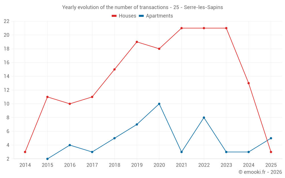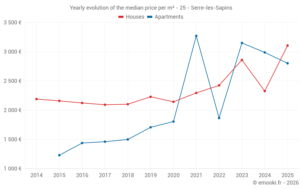 The median price on the 29 house transactions of the last 24 months in the municipality of Serre-les-Sapins was 2 642 € per square meter for a median property value of 295 000 €. Over this period, 60% of transactions were between 2 025 and 3 064 € per square meter (from the 2nd to the 8th deciles).