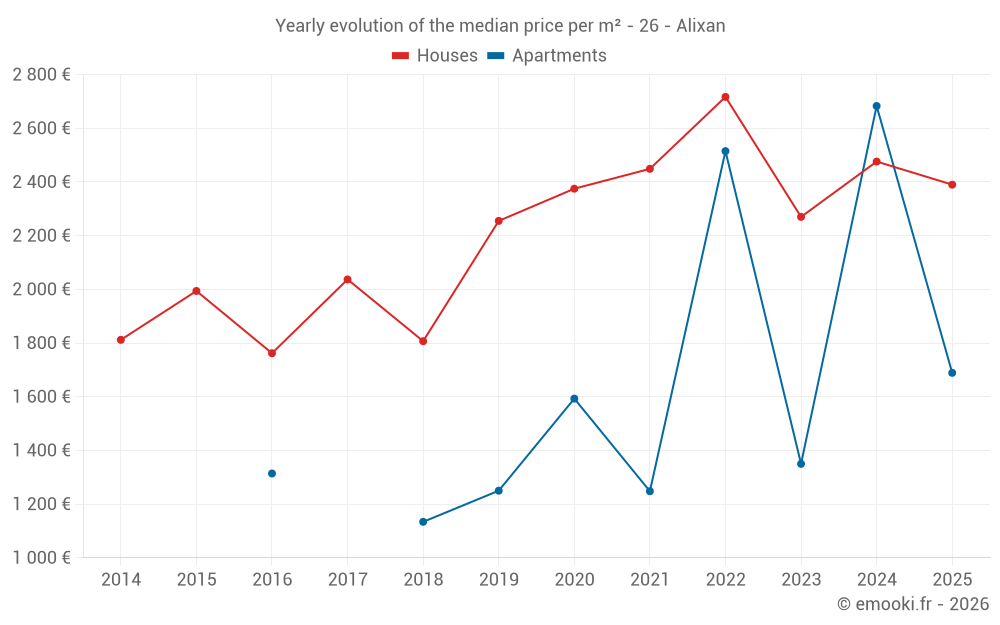 The median price on the 25 house transactions of the last 12 months in the municipality of Alixan was 2 471 € per square meter for a median property value of 253 550 €. Over this period, 60% of transactions were between 1 503 and 2 968 € per square meter (from the 2nd to the 8th deciles).