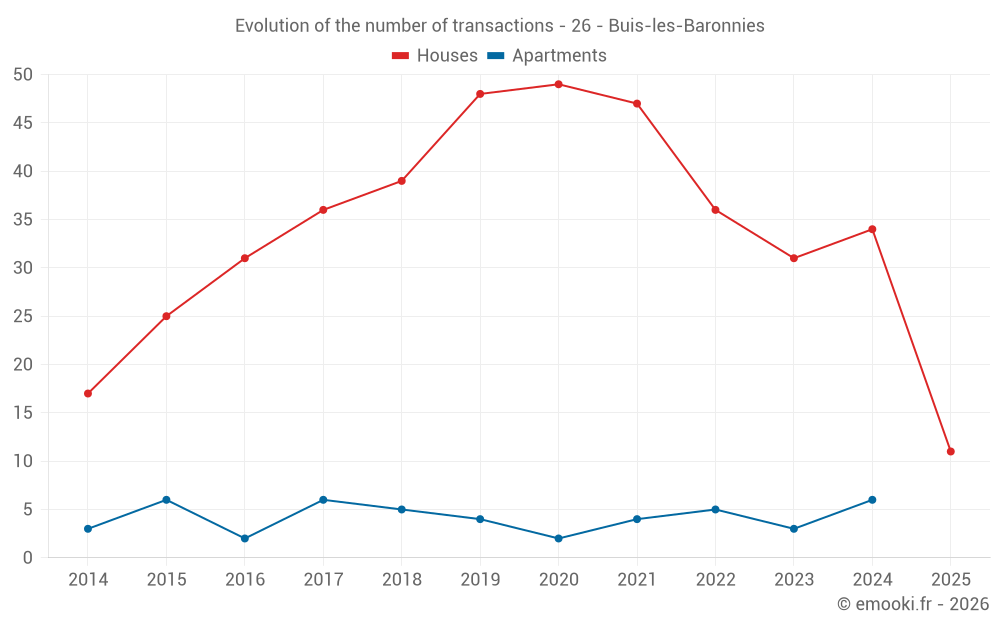 The median price on the 27 house transactions of the last 12 months in the municipality of Buis-les-Baronnies was 2 711 € per square meter for a median property value of 190 000 €. Over this period, 60% of transactions were between 2 051 and 3 640 € per square meter (from the 2nd to the 8th deciles).