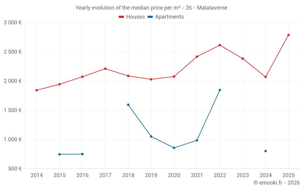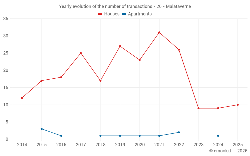 The median price on the 24 house transactions of the last 24 months in the municipality of Malataverne was 2 455 € per square meter for a median property value of 250 000 €. Over this period, 60% of transactions were between 1 907 and 3 167 € per square meter (from the 2nd to the 8th deciles).