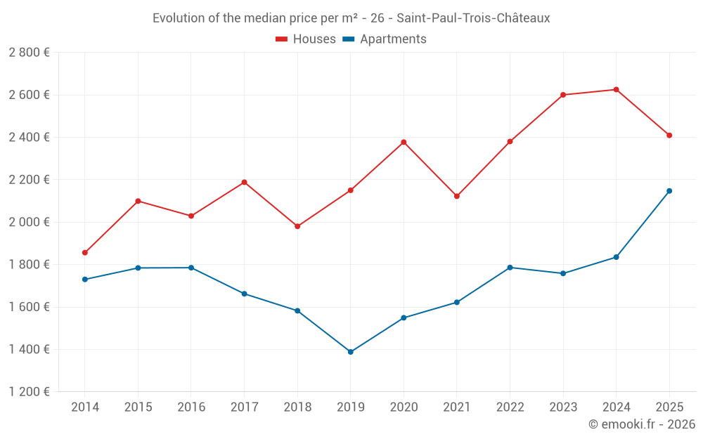 The median price on the 29 apartment transactions of the last 12 months in the municipality of Saint-Paul-Trois-Châteaux was 1 949 € per square meter for a median property value of 132 500 €. Over this period, 60% of transactions were between 1 249 and 2 646 € per square meter (from the 2nd to the 8th deciles).