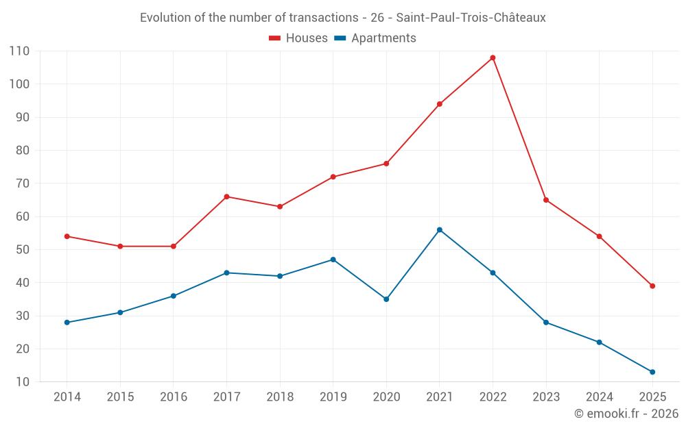 The median price on the 22 house transactions of the last 3 months in the municipality of Saint-Paul-Trois-Châteaux was 2 332 € per square meter for a median property value of 237 500 €. Over this period, 60% of transactions were between 1 945 and 2 819 € per square meter (from the 2nd to the 8th deciles).